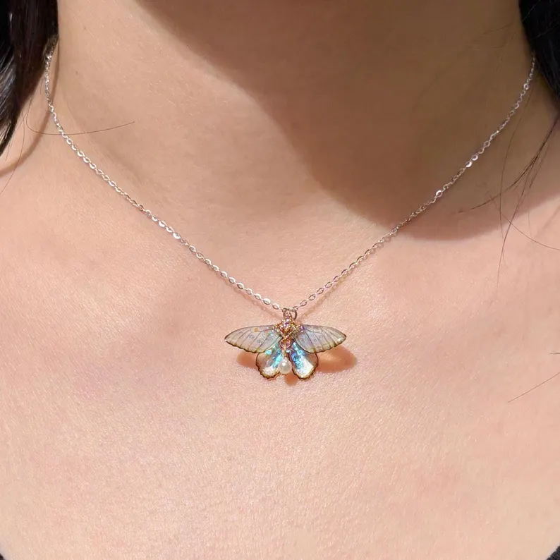 | Cute Moth Necklace, Moth Wings With Pearl Jewelry, Insect Fairy Resin Moth Pendant, Gift For Her |