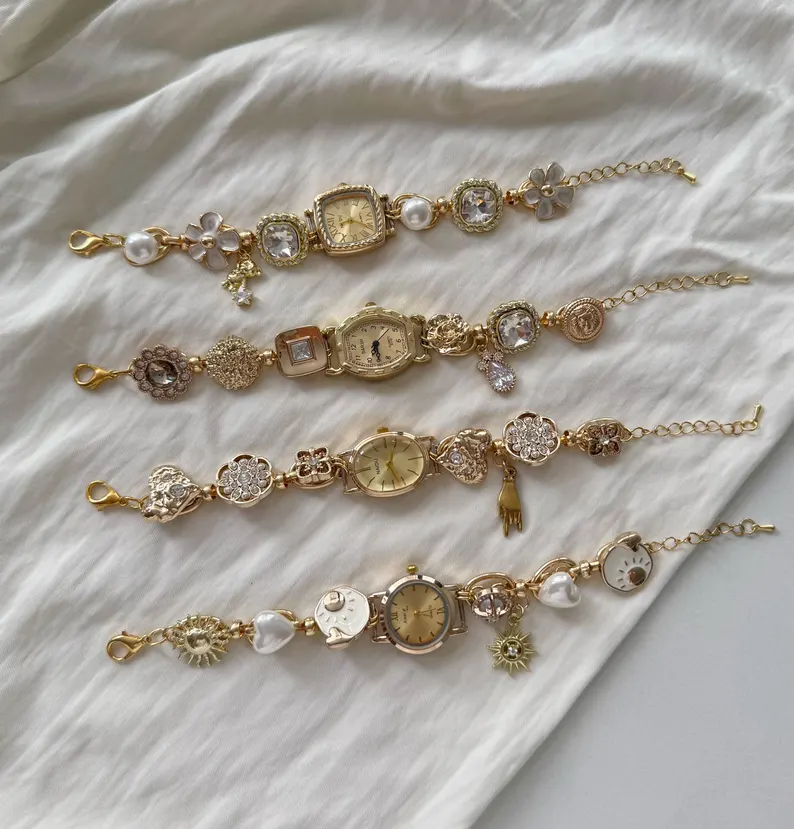 | Retro Charms Watch Bracelet,Gold Plated Pearl & Bead Charms Jewelry,Feminine Romantic Timepiece,Dainty Wristwatch,Custom Gift for Women |